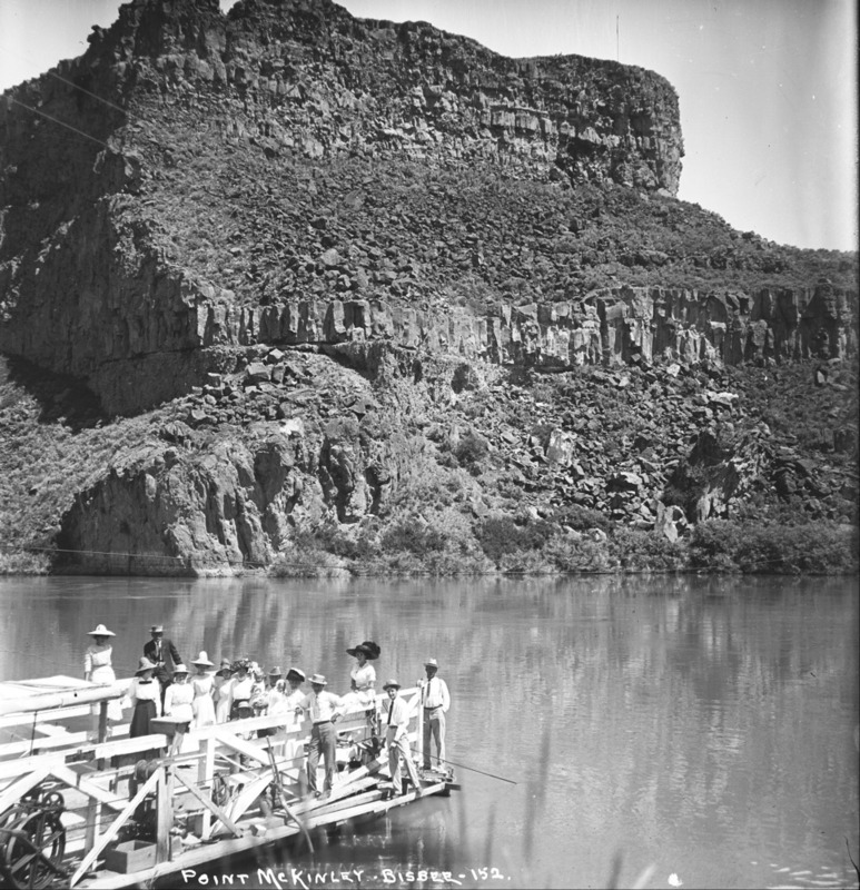 - "Point McKinley;" a group of people ride on the ferry across the Snake River above the Shoshone Falls.
