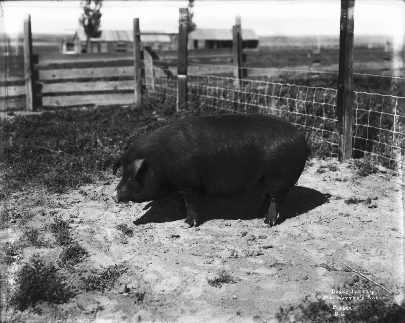 - "Duroc Jersey. MacWatter's Ranch;" a large pig in a fenced pen; outbuildings can be seen in the distance