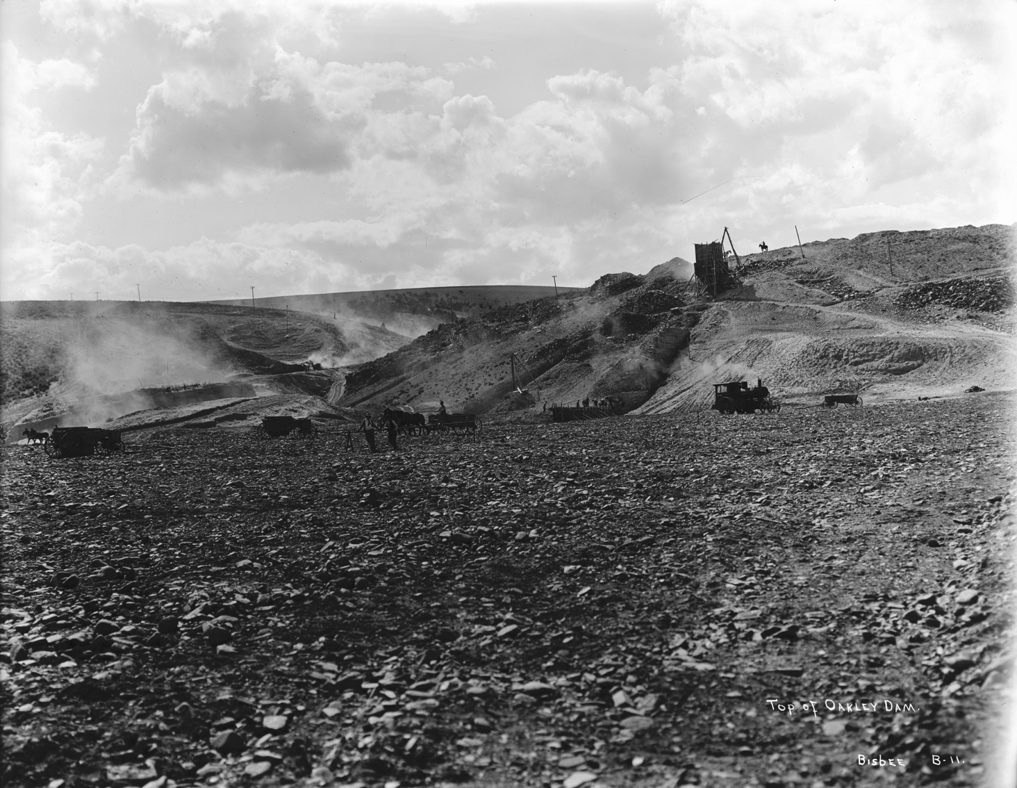 - "Top of Oakley Dam;" crews working at moving fill dirt