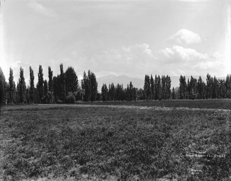 - "Idaho, Near Beautiful Oakley;" a field lined with trees; Albion Mountains in the background