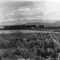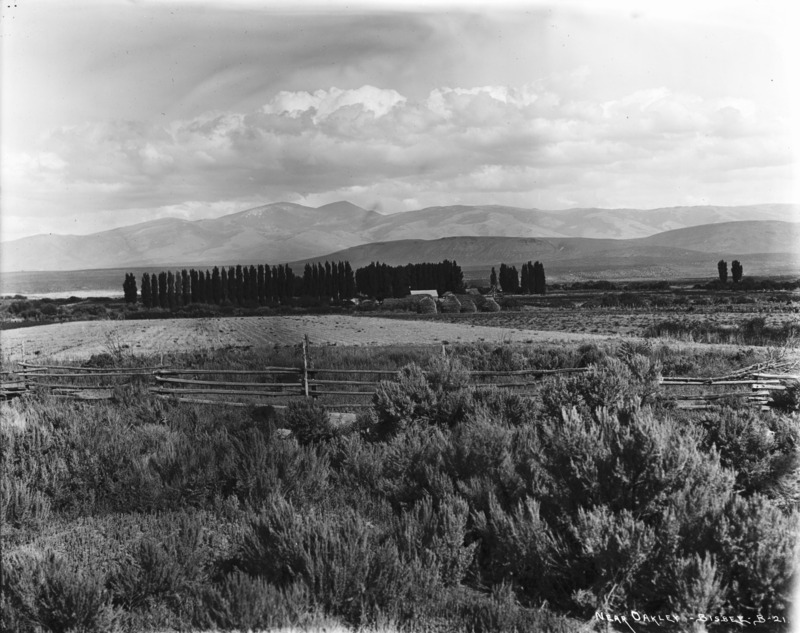 - "Near Oakley;" looking across fields at a farmstead with poplar trees; Albion Mountains in background