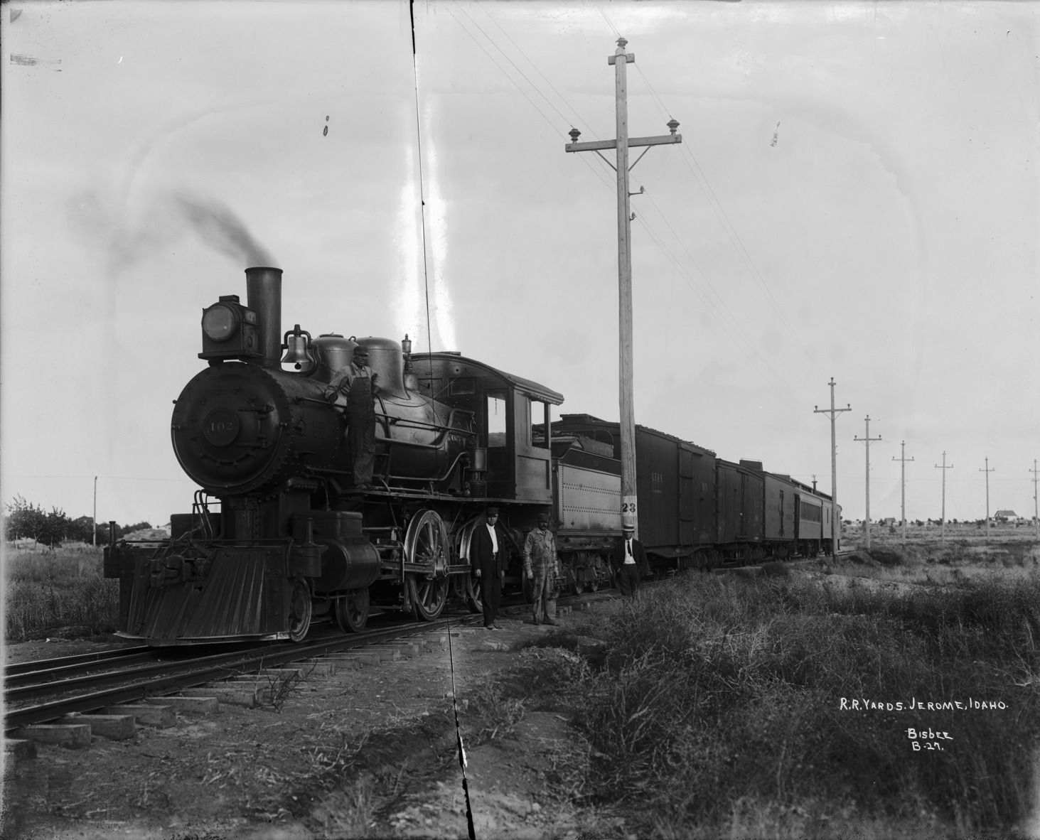- "R. R. Yards. Jerome, Idaho;" train with a 3-man crew; railroad track is lined with power poles