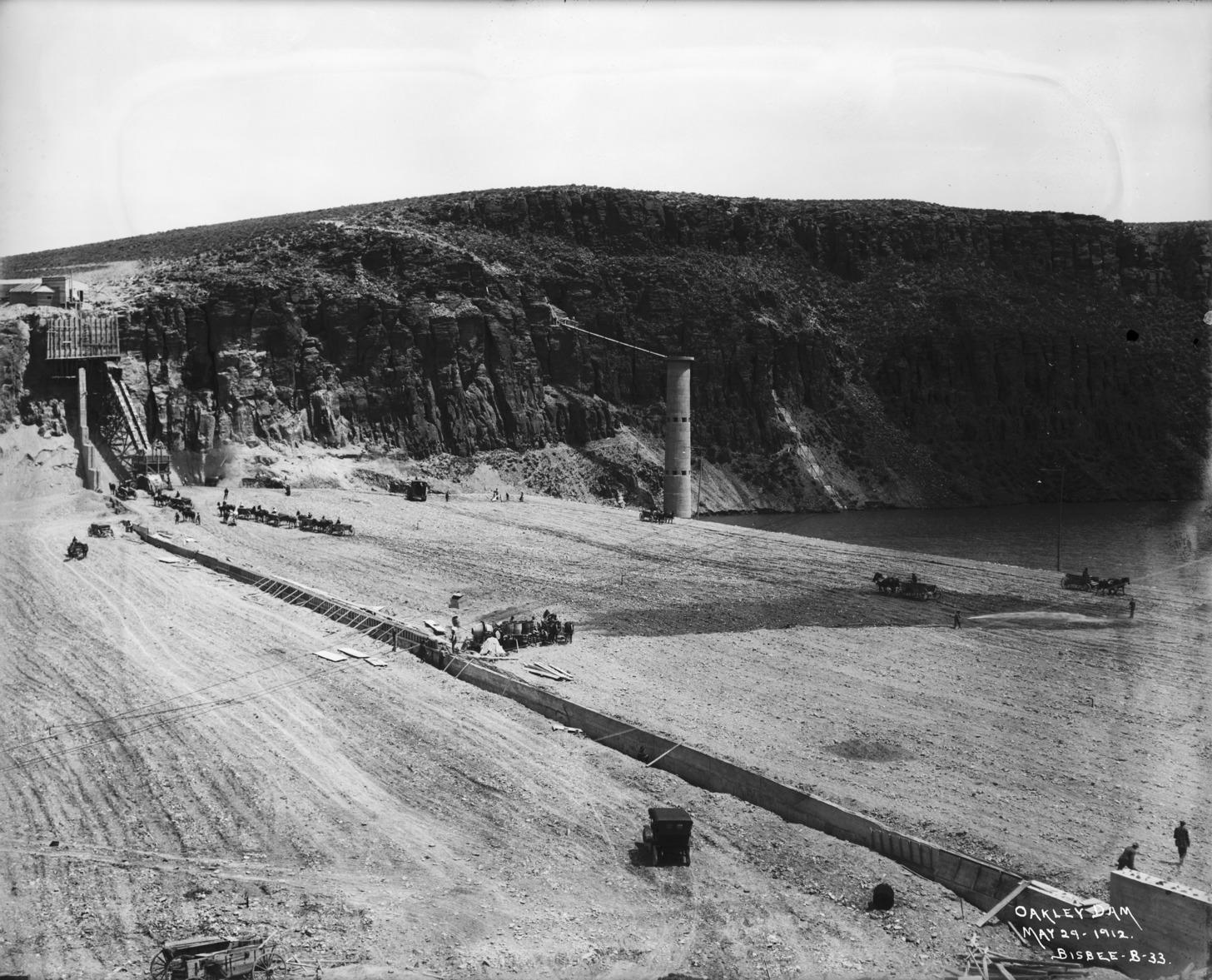 - "Oakley Dam, May 29, 1912;" crews with teams of horses working on the dam