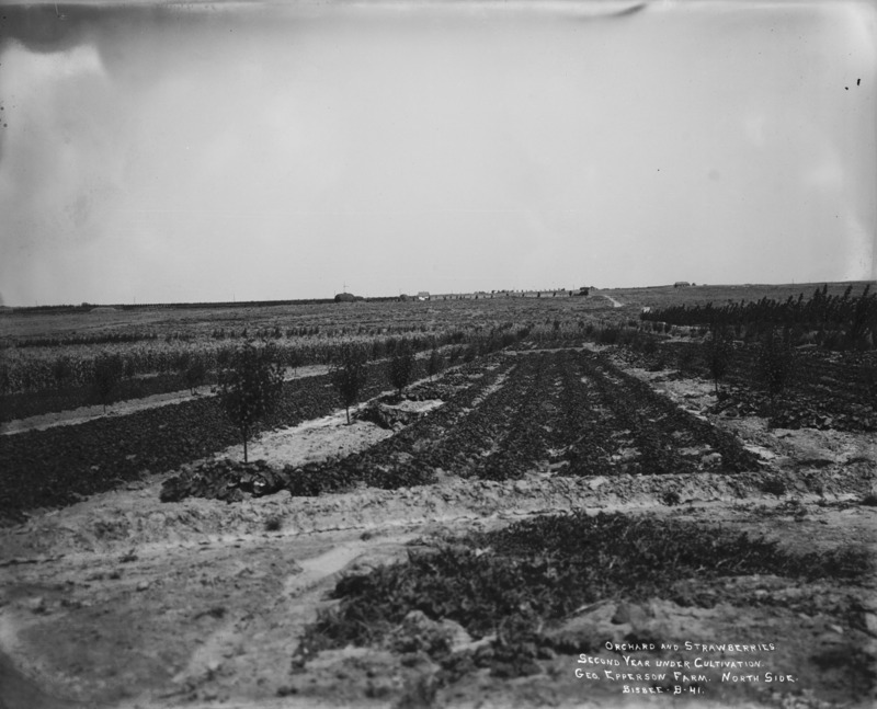 - "Orchard and Strawberries. Second Year Under Cultivation; George Epperson Farm. North Side;" irrigated field, with farmstead and several buildings in background