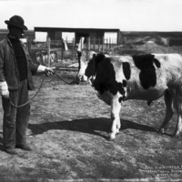 - "Year Old Holstein Bull; Overbrook Farms, Jerome, Idaho;" a man stands holding a rope tied to the nose ring of a cow.