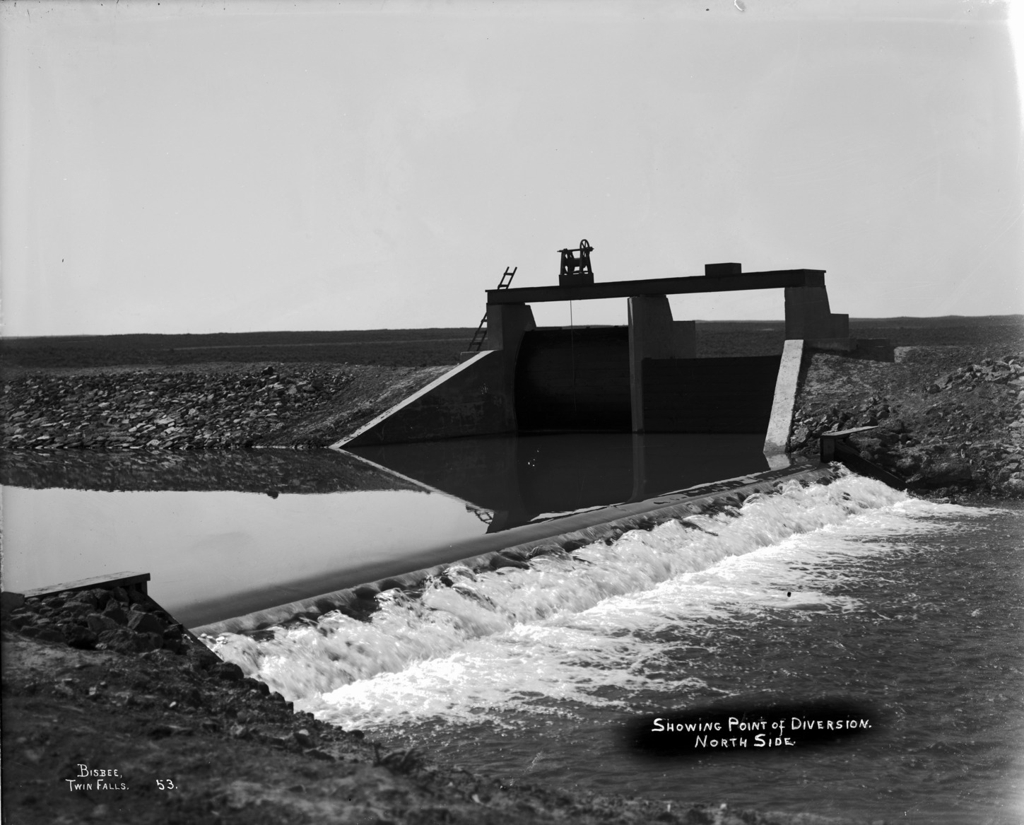 - "Showing Point of Diversion. North Side;" water flowing over diversion channel near gates
