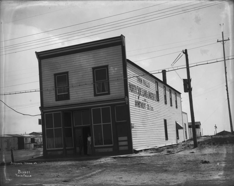 - "Jerome, Idaho;" the Twin Falls North Side Land and Water Compnay and Investment Company, Ltd. Building. A woman stands in the doorway, speaking to a man.