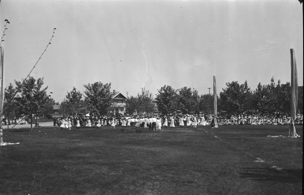 - People gather around the edges of the park near the maypoles on May Day in Twin Falls City Park. Several houses can be seen in the background.
