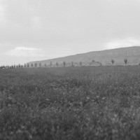 - Panoramic view of a field and row of trees at the bottom of canyon.