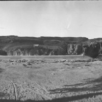 - Panoramic view above Shoshone Falls, showing the construction of the dam.