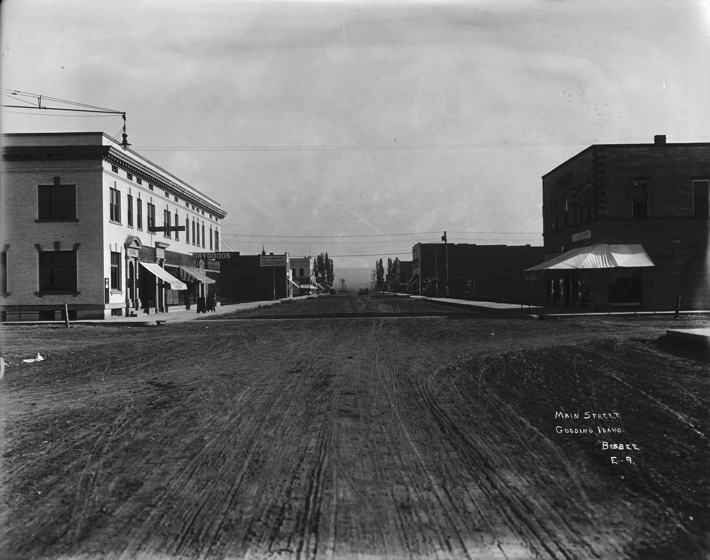 - "Main Street, Gooding, Idaho;" view down an intersection with several buildings. Businesses visible include: a bank; hardware store; dry goods; The Toggery, Gent's Furnishings, Clothing, Shoes; Light and Power; a hotel; and the U.S. Post Office.