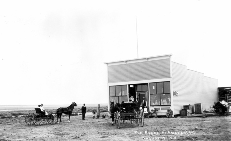 - "The Store at Amsterdam. August 17th, 1912;" a wood frame general store with two buggies, with horses, and several people standing in front of and next to building.