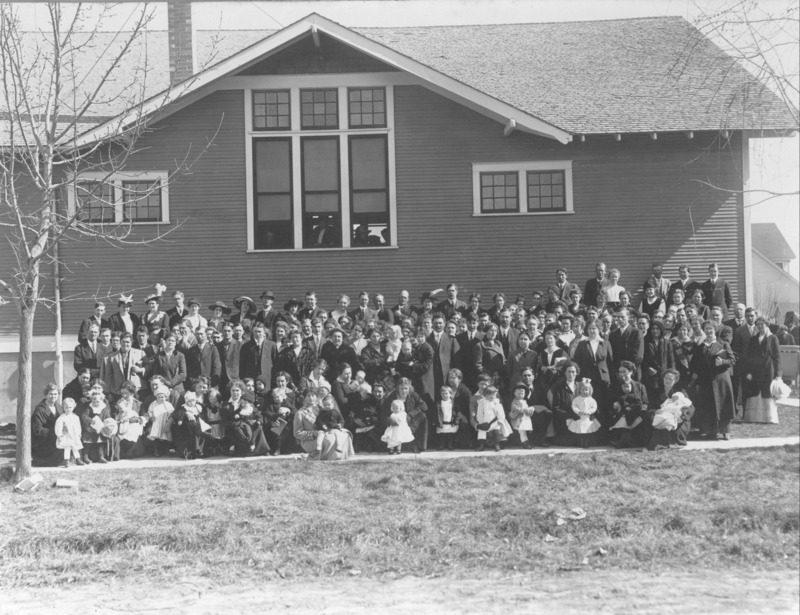 - Group of people, children and adults, posed outside the First Christian Church. {Other denominations that used the building included the Immanuel Lutheran Church, Grace Baptist Church, Gospel Temple Church, and Reformed Church,}