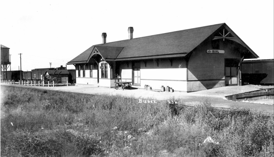 - Railroad station (depot) at Buhl. A water tower and a smaller outbuilding at left; several rail cars on tracks behind station.