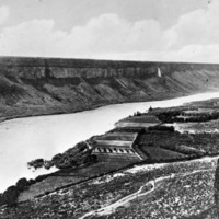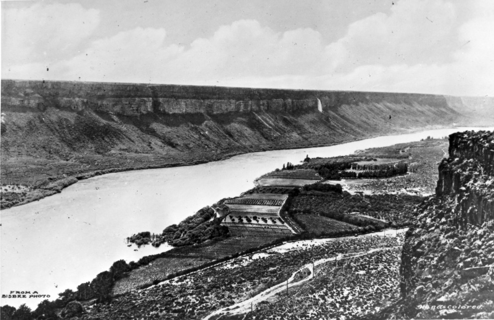 - Perrine's Blue Lakes farm and orchard taken from a hand-colored postcard based on an original Bisbee photo (522), looking west along the north side of the Snake River Canyon. Telephone poles and the Perrine Coulee visible.
