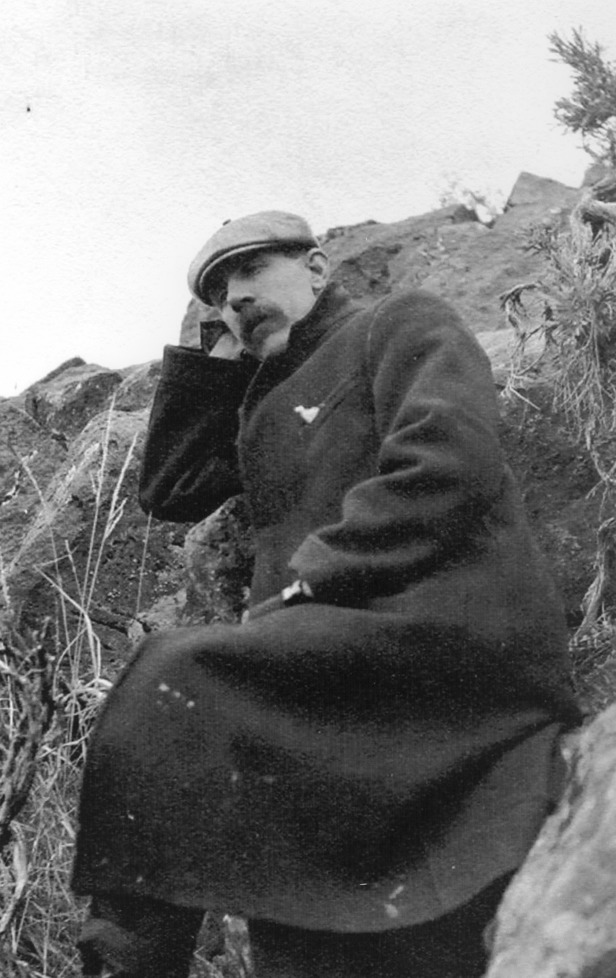 - Clarence E. Bisbee, in an overcoat, posing for a photo; rock canyon wall behind him.