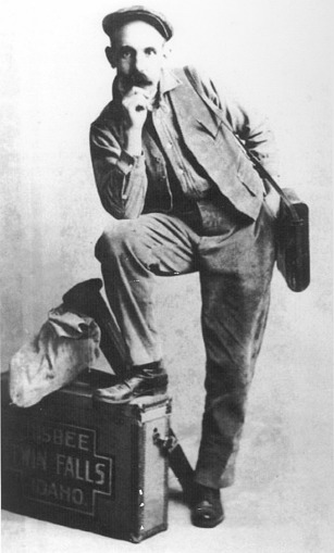- Clarence Bisbee posing with some of his photographic equipment, his foot resting on his glass plate negative box. {Copy possibly taken from a printed original.}
