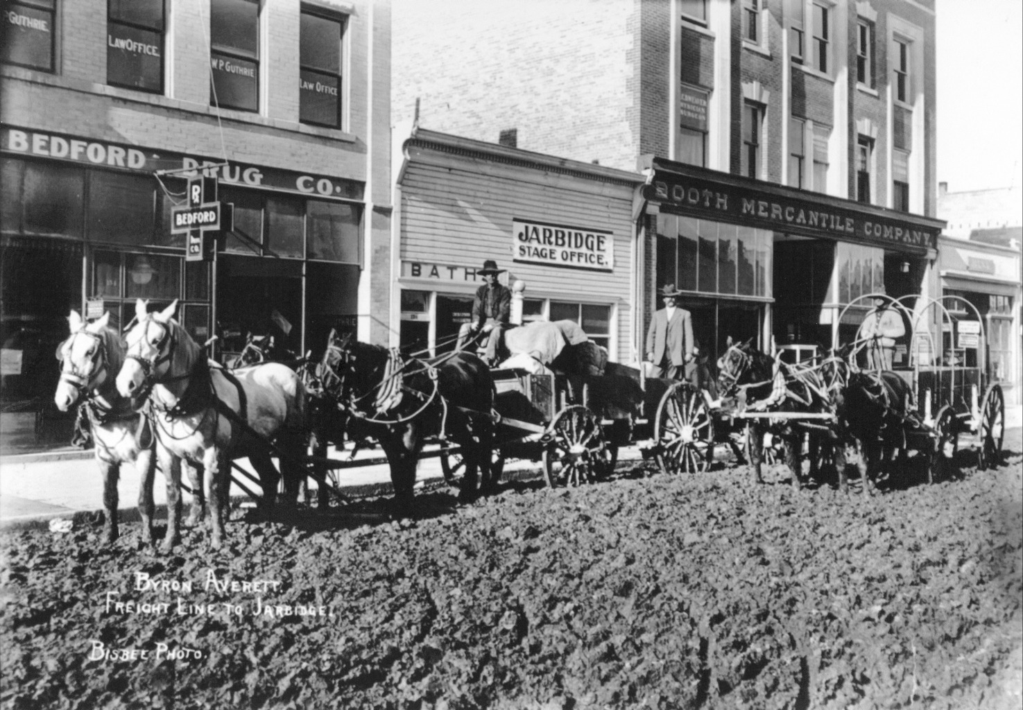 "Byron Averett, Freight Line to Jarbidge;" two teams with freight wagons parked alongside the boardwalk (sidewalk) of Main Ave. Two men drive the wagons, another stands on the boardwalk. Behind them are the Bedford Drug Co, with the W. P. Guthrie Law Office; Baths and the Jarbidge Stage office; the Booth Mercantile Company; and the McCornick Bank (later known as the Twin Falls Bank and Trust.)