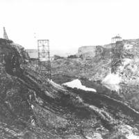 - "July 6, 1927;" Construction on the original Twin Falls Jerome Intercounty Bridge (later known as the Perrine Bridge); two cranes visible on either side of the canyon, with steel uprights of the bridge already affixed to the canyon walls. Looking west toward Blue Lakes and Perrine's farm and orchard.