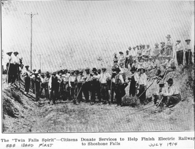 - "The 'Twin Falls Spirit' - Citizens Donate Services to Help Finish Electric Railway to Shoshone Falls;" a group of men in dress shirts and hats pose with tools in and on the sides of a depression in the road. {Though attributed to the July 1914 article in "See Idaho First," this is not accurate.}