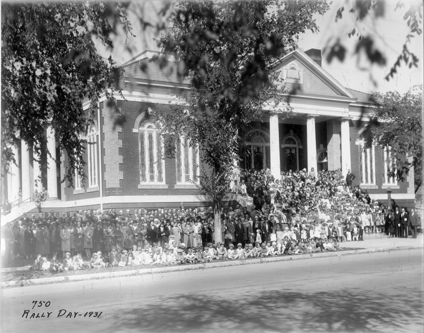 - "Rally Day - 1931;" large group of people pose on the Shoshone St facing steps of the First Christian Church.