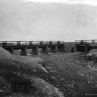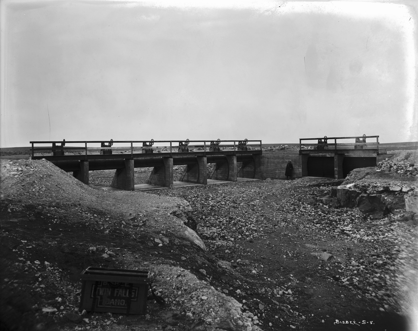 - A man (possibly Bisbee) stands in a dry canal bed among several gates from a reservoir. Bisbee's photograph box in the foreground.
