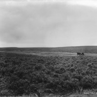 - A two-horse buggy is driven along the edge of a flat, dry canal amidst the sage brush.