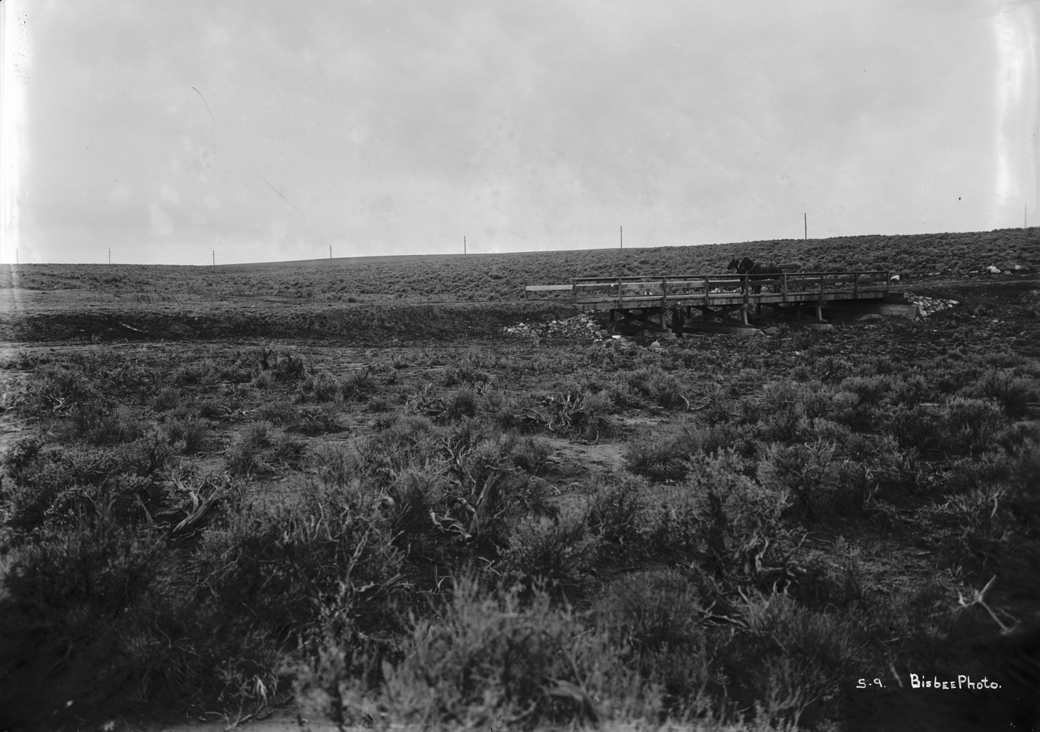 - A two-horse buggy stands on a low bridge above a dry streambed or canal amidst the sage brush. A man stands beneath the bridge.