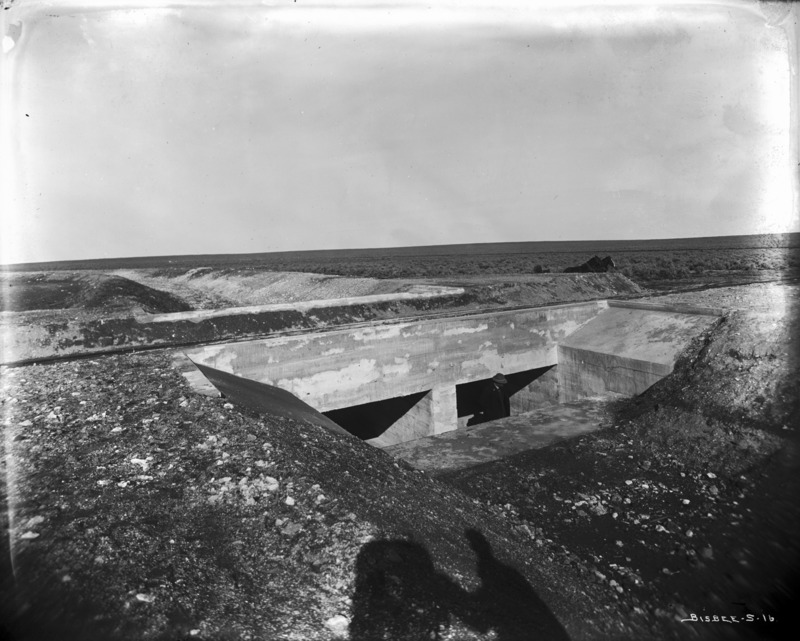 - A canal siphon under a railroad track. A man stands underneath; two horses and a buggy are visible behind the berm.