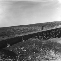 - A man stands atop an elevated canal flume.