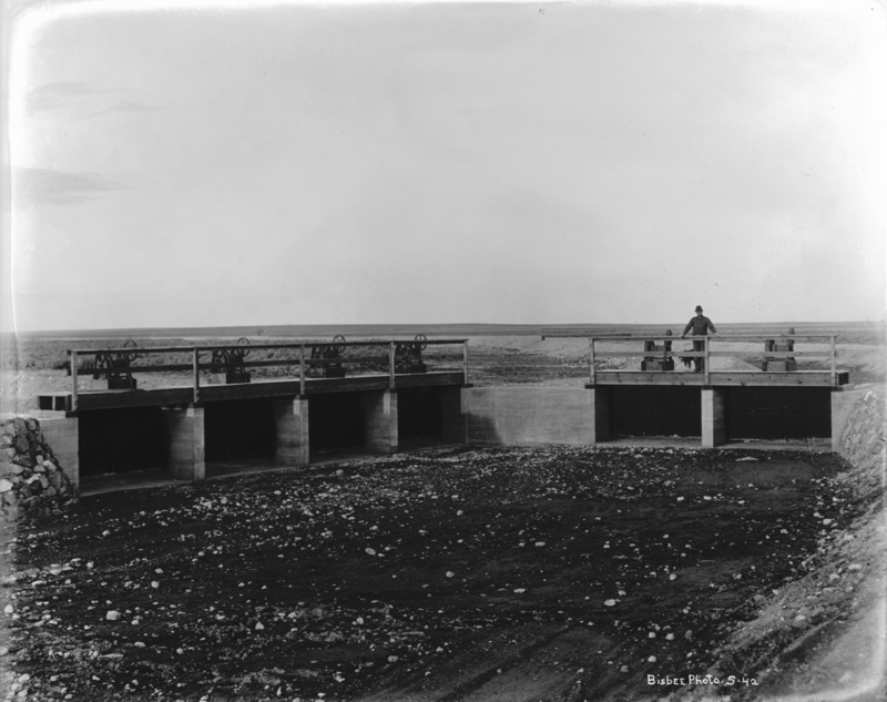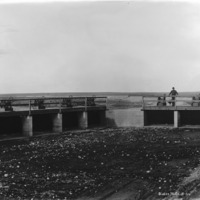 - A man stands atop canal gates over a dry canal bed.