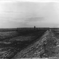 - A man and a dog stand on a low bridge over a dry canal bed.