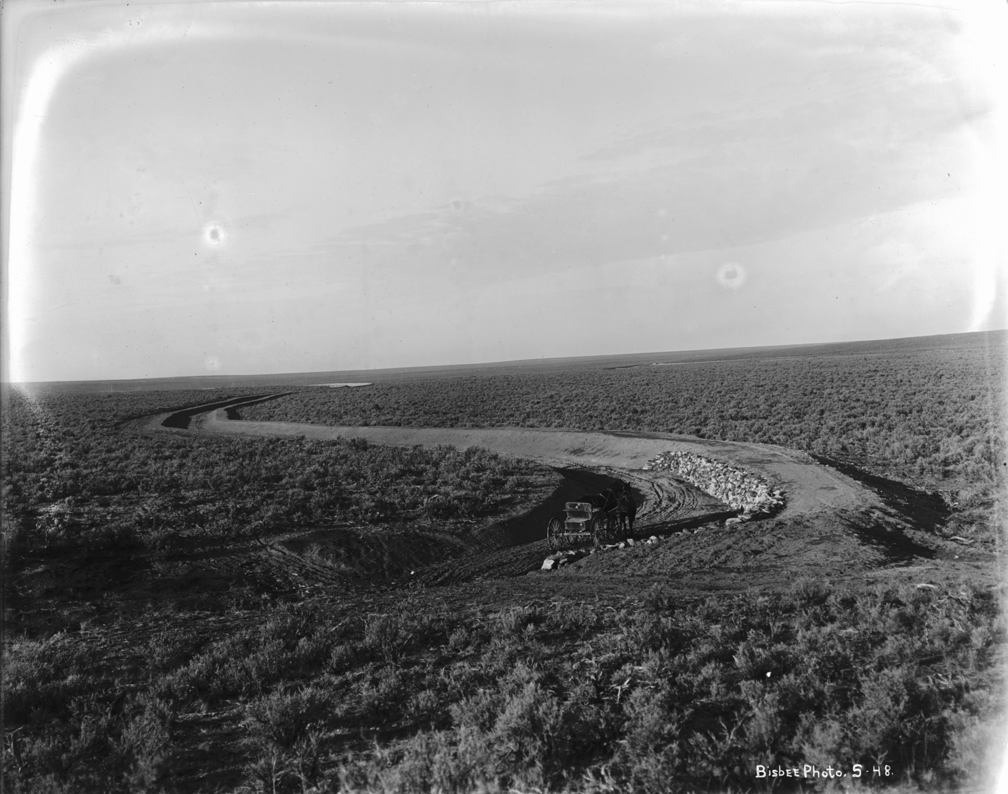 - Wide view of a dry canal traversing the sage brush; a two-horse buggy stands in the dry canal bed in the center.