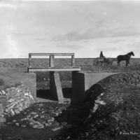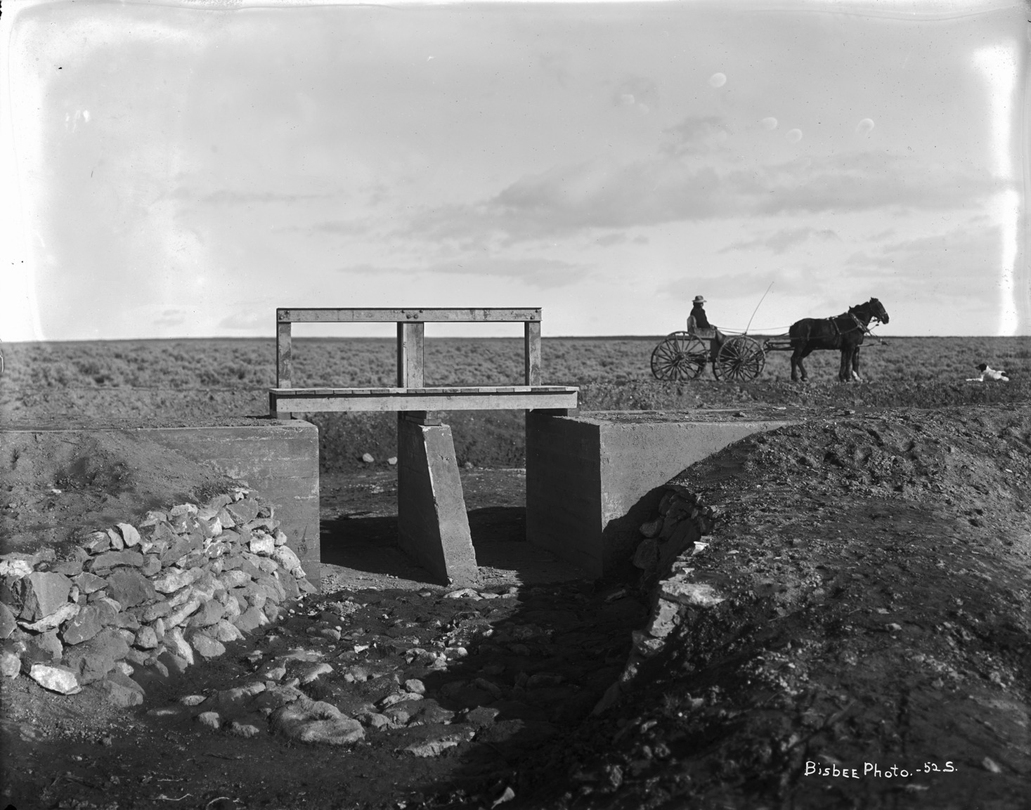 - A man in a two-horse buggy is stopped beside a canal gate. A dog lies in front of them.
