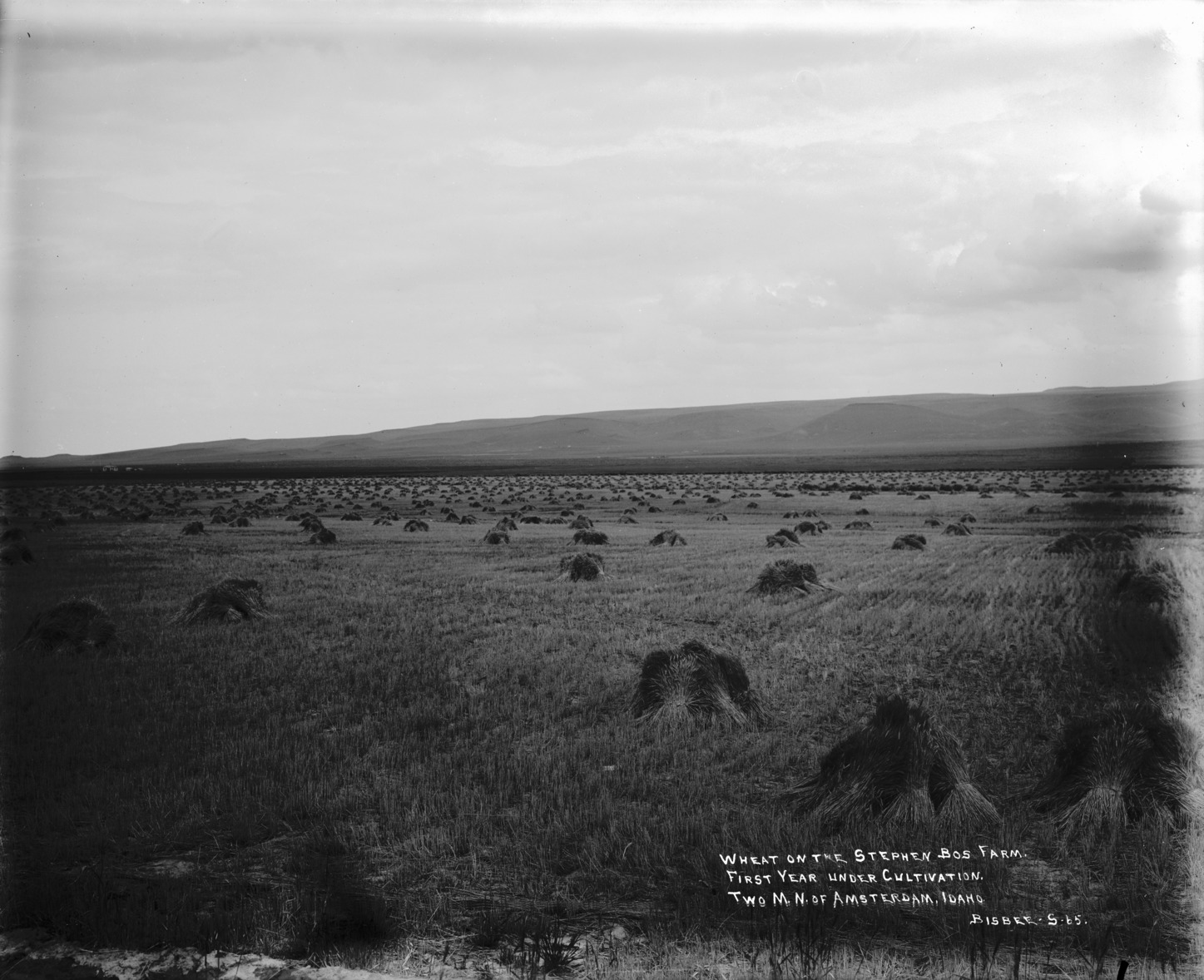 - "Wheat on the Stephen Bos Farm. First year under cultivation. Two miles north of Amsterdam, Idaho;" sheaves of wheat do the fields; foothills in background.