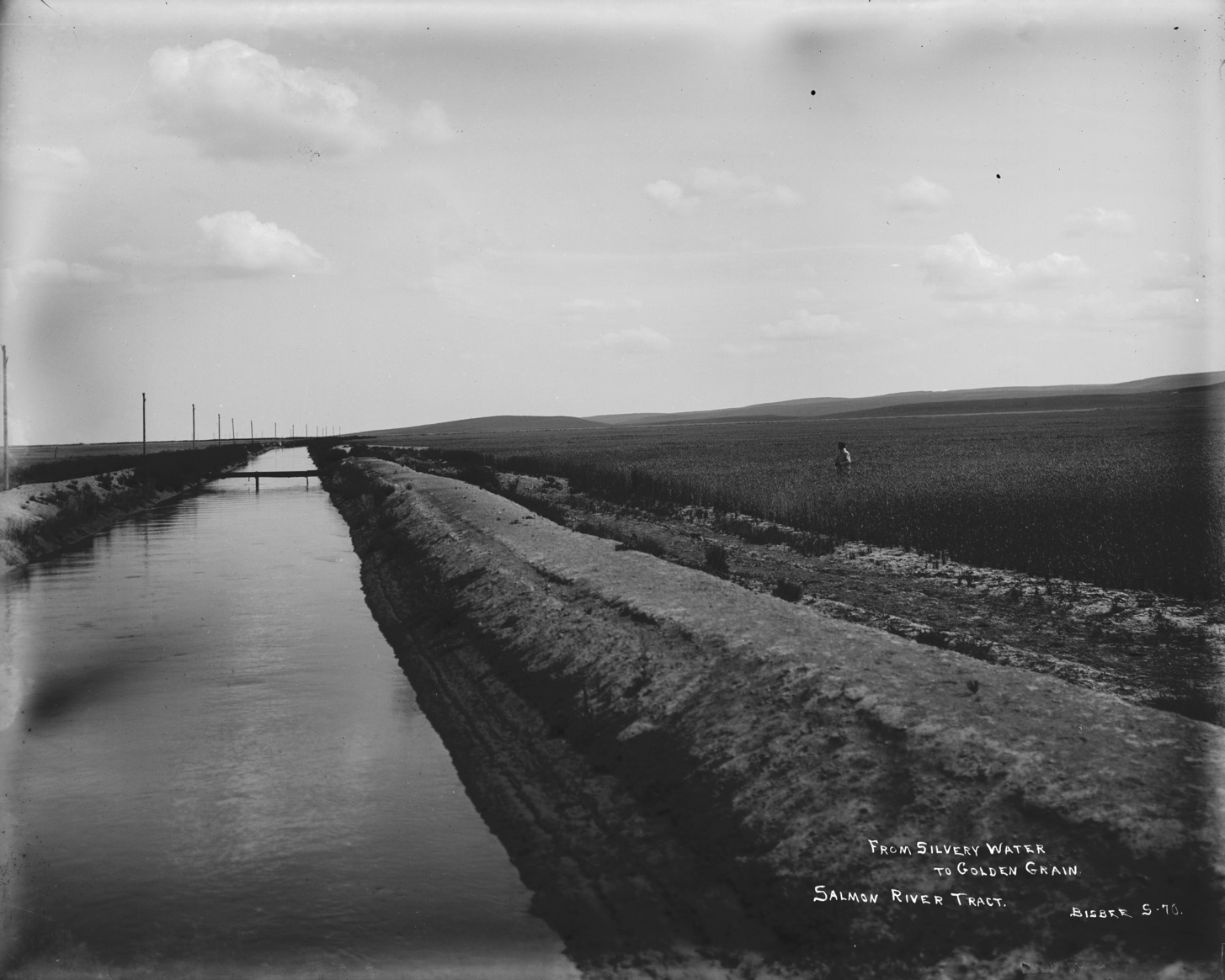 - "From Silvery Water to Golden Grain. Salmon River Tract;" view down a canal and berm surrounded by fields. A man stands in the field on the right.