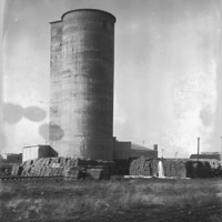 - "The Harvest. Second Year of Cultivation; Salmon Tract, 1912;" silo or elevator attached to a lower building; sacks of produce piled in foreground; Ostrander Lumber building on right.