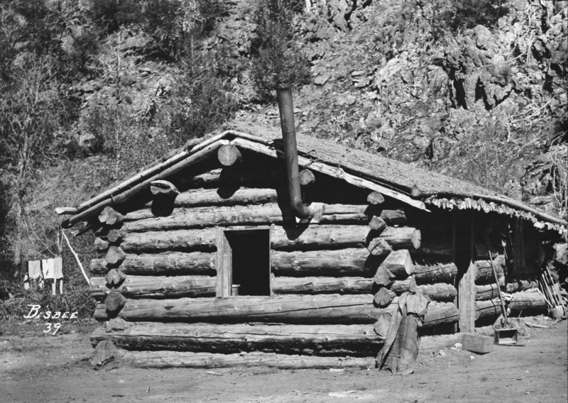 - A log cabin situated at the base of a canyon wall