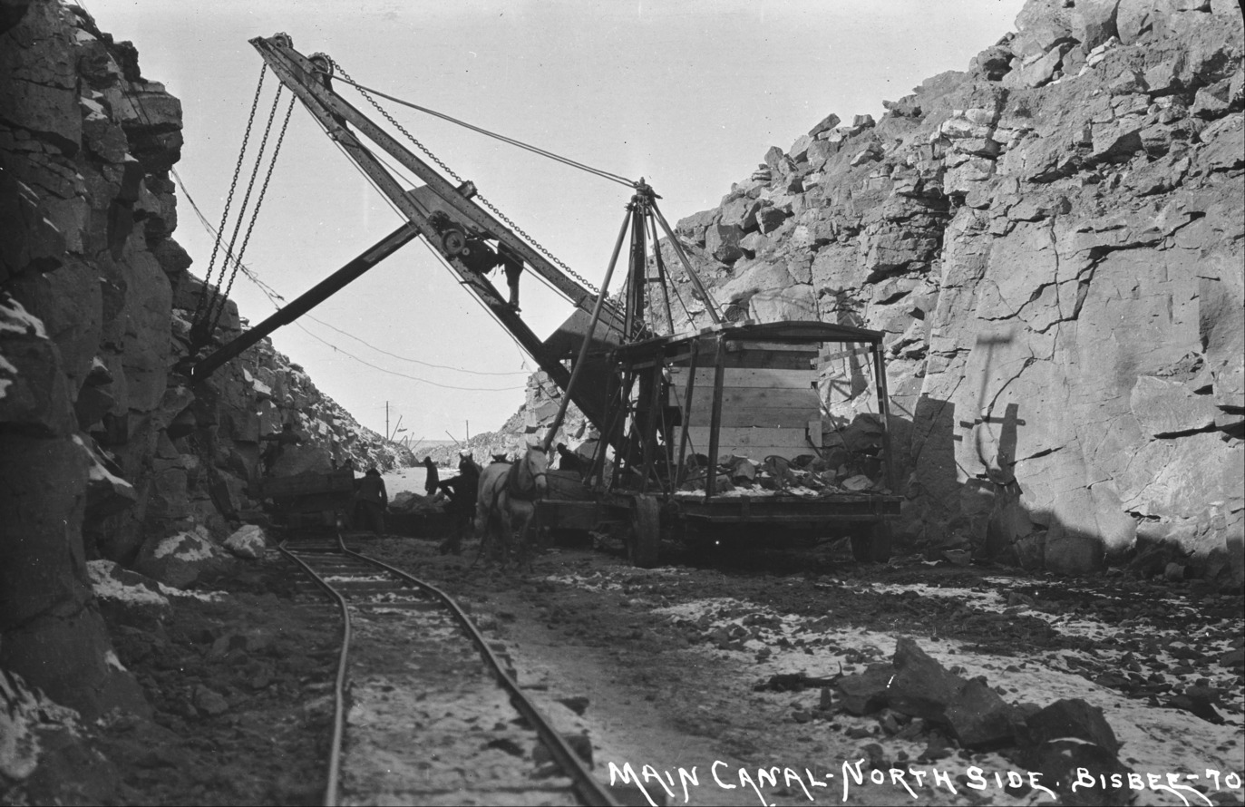 - "Main Canal - North Side;" men and machinery digging out the canal, tram rail visible on left.
