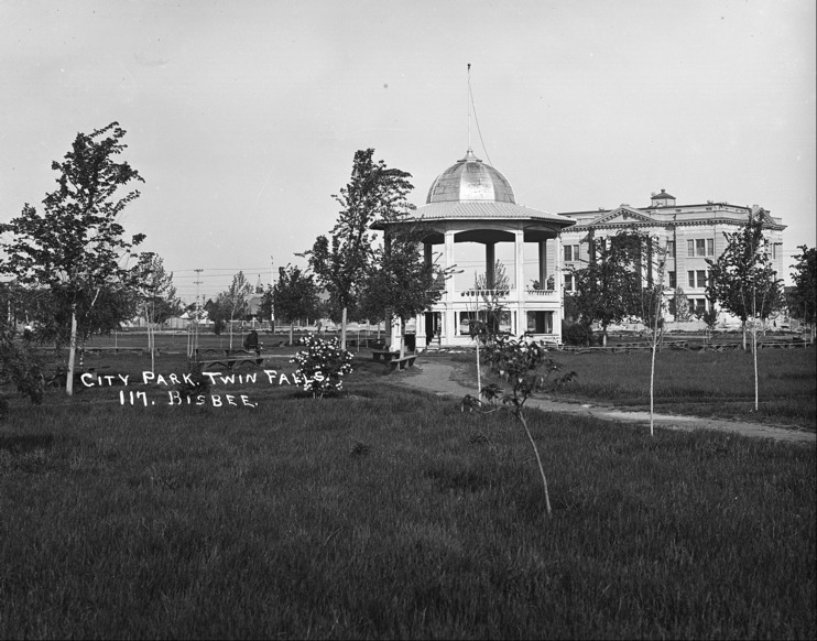 - "City Park, Twin Falls" The park gazebo (band stand) is shown, with the Court House in the background.