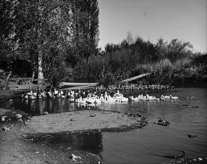 - Ducks float on a pond.