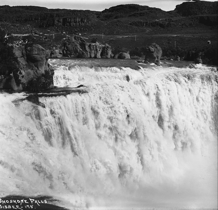 - "Shoshone Falls;" close-up view from the north side of the canyon, power lines and outbuildings can be seen on the south side.