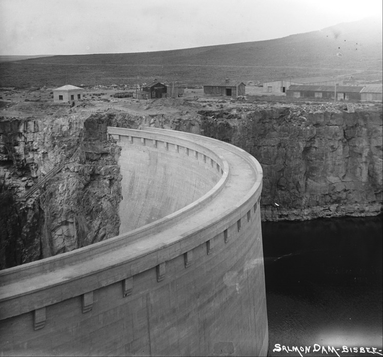 - "Salmon Dam;" view of the dam from the west canyon wall, with construction buildings on the far side.