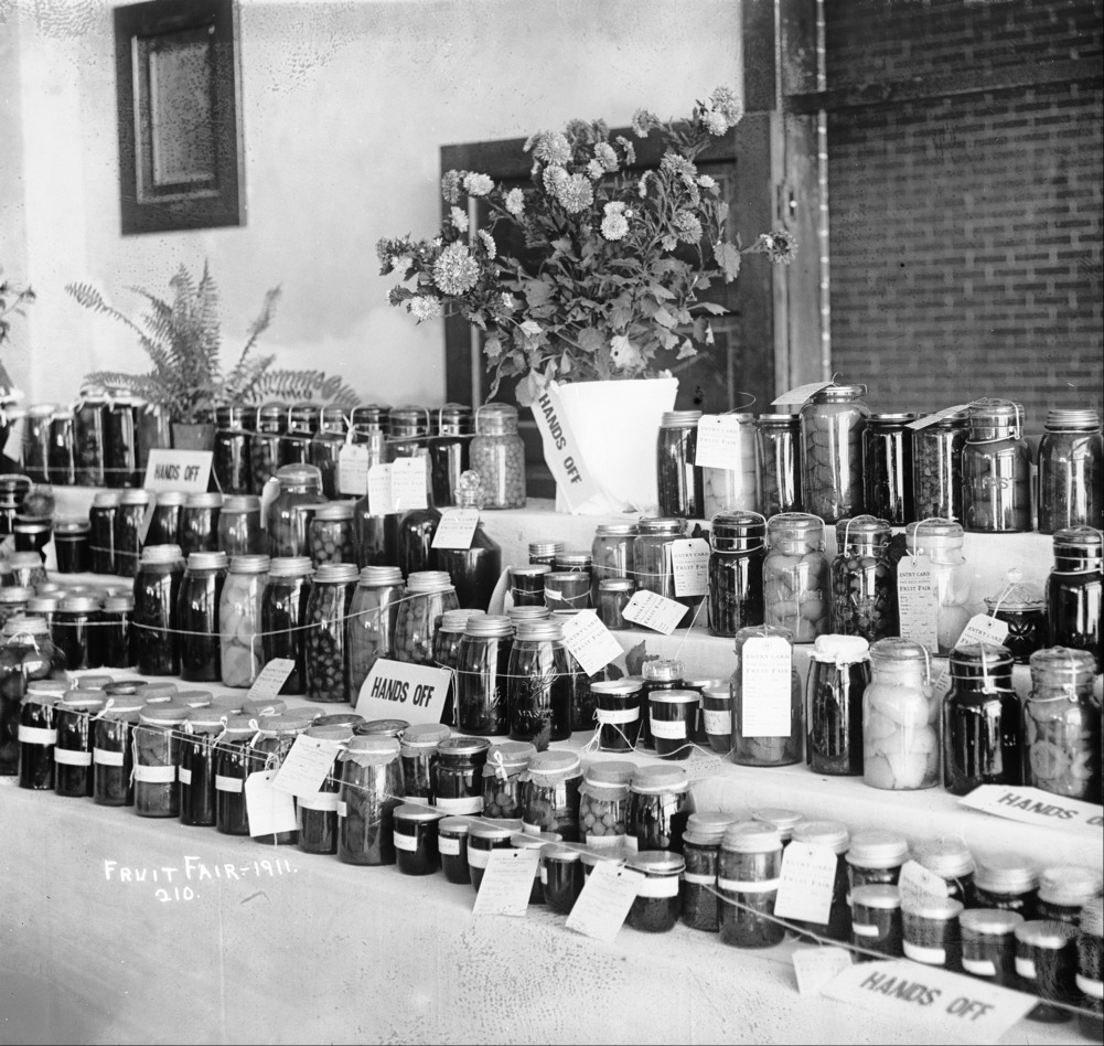 - "Fruit Fair - 1911;" jars of canned fruit and vegetables are displayed on risers at the Twin Falls County Fair.