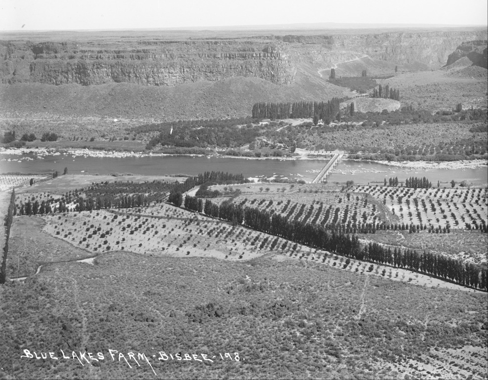 - "Blue Lakes Farm;" the Perrine land and orchard, looking north toward Blue Lakes in the Snake River Canyon. The Blue Lakes Perrine toll bridge connects the banks.