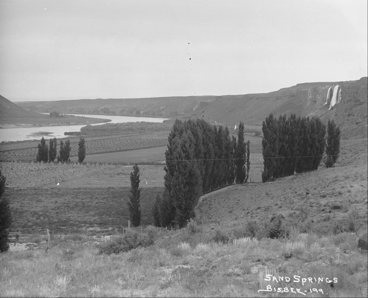 - "Sand Springs;" view of waterfall and fields in the Hagerman Valley.