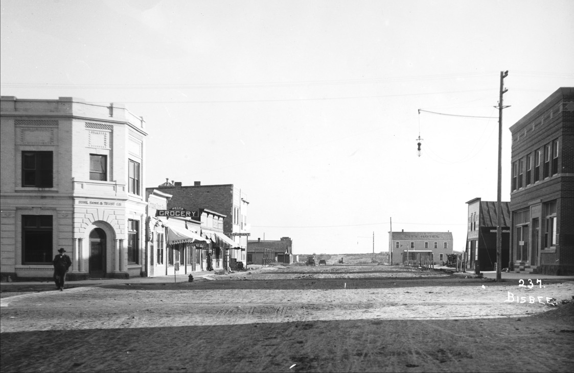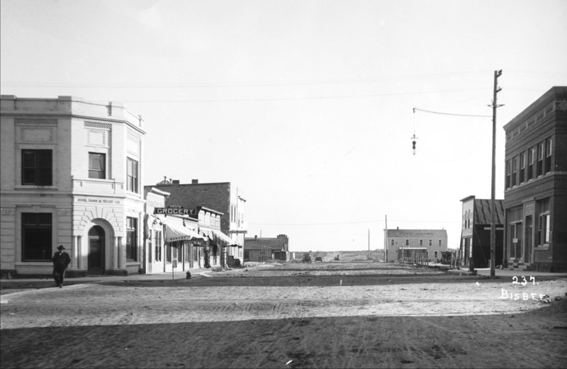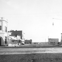 The corner of Main Street and Broadway Avenue in Buhl, Idaho, showing the Buhl Bank & Trust Building. Other businesses visible include: Peck's Grocery, a bakery, a restaurant, baths, a livery, City Hotel