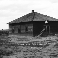 - "Hollister's First School House and Church;" a one-story wooden frame building. A bell on a platform is at the rear, with a ladder leading to the top. A smaller outbuilding is on left.