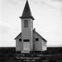 - "Amsterdam Church;" plain wood church with tall steeple.
