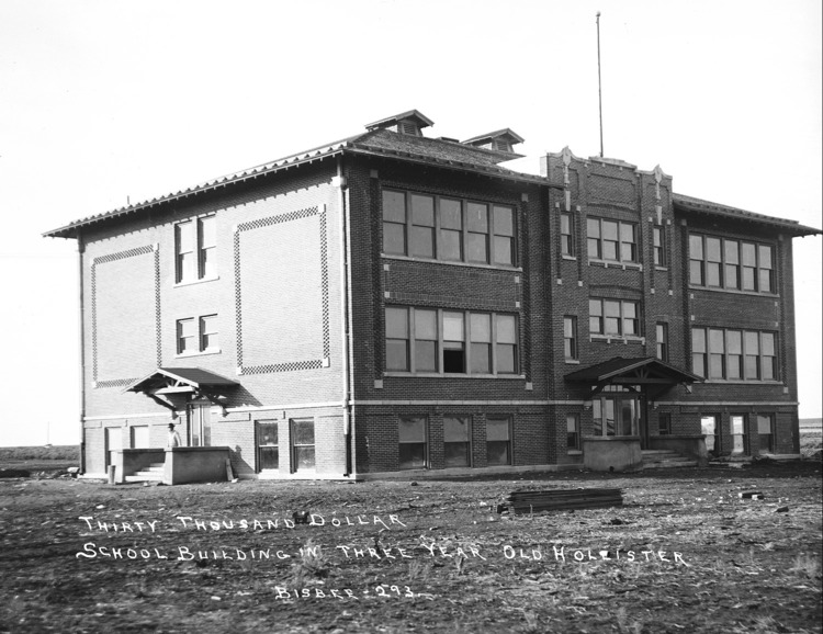 - "Thirty Thousand Dollar School Building in Three Year Old Hollister;" brick school near construction completion. A man is on the stairs at the side of the building,